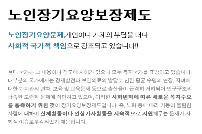 노인장기요양보장제도란 노인장기요양문제, 개인이나 가계의 부담을 떠나 사회적 국가적 책임으로 강조되고 있습니다.
