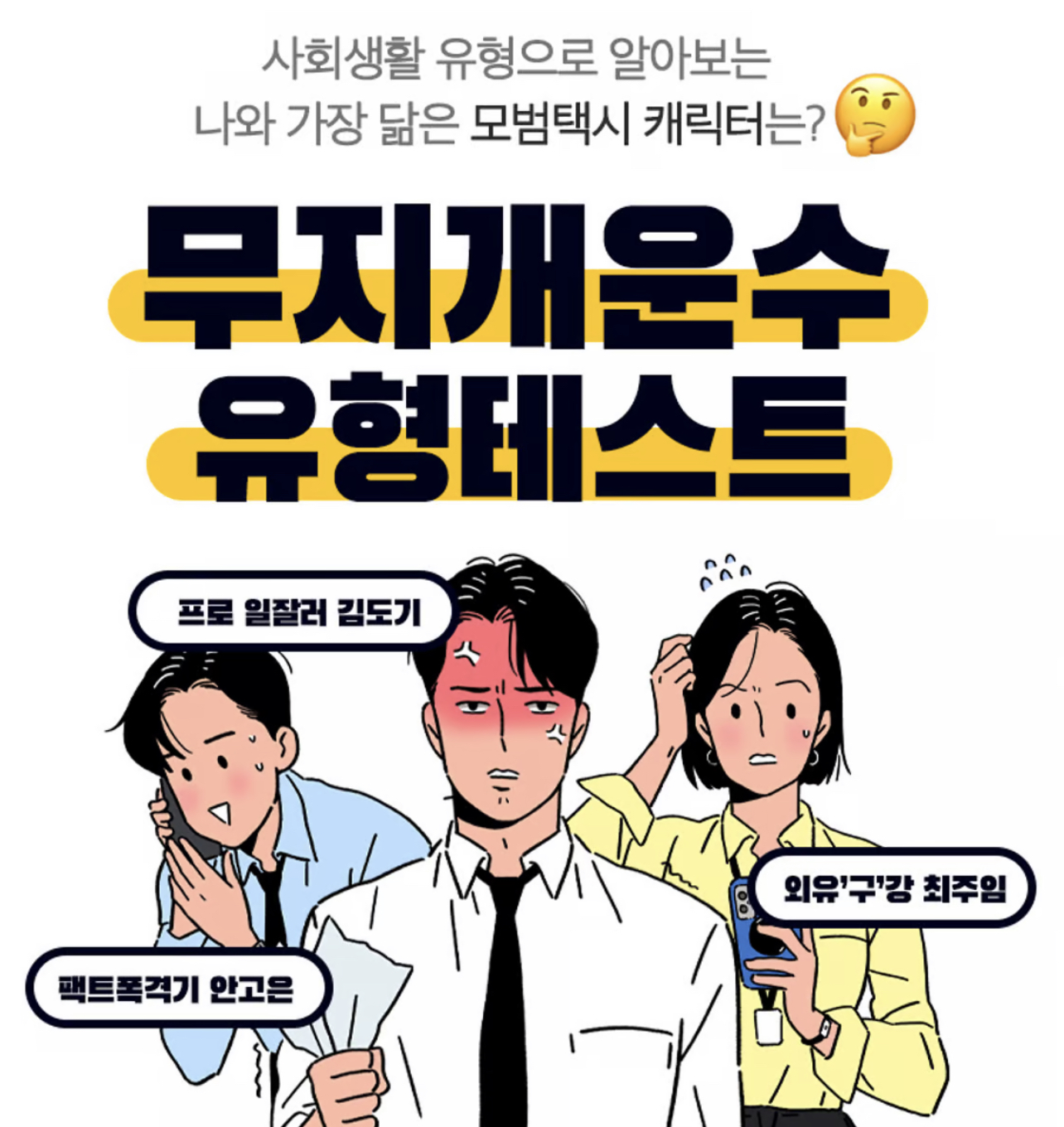 사회생활유형으로 알아보는 나와 가장 닮은 모범택시 캐릭터는 누구인지 알아보는 재밌는 테스트가 있다고 하는데 여러분들께 소개드리려 합니다.