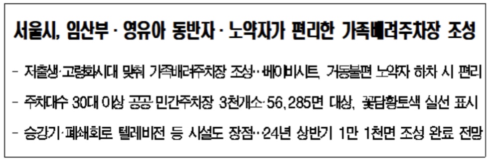 서울시가 임산부, 영유아, 노약자 및 이들을 동반한 사람들이 우선 이용할 수 있는 ‘가족배려주차장’을 조성하고, 접근성과 편의를 높여 약자와 동행하는 교통·주차 서비스를 제공한다고 합니다.