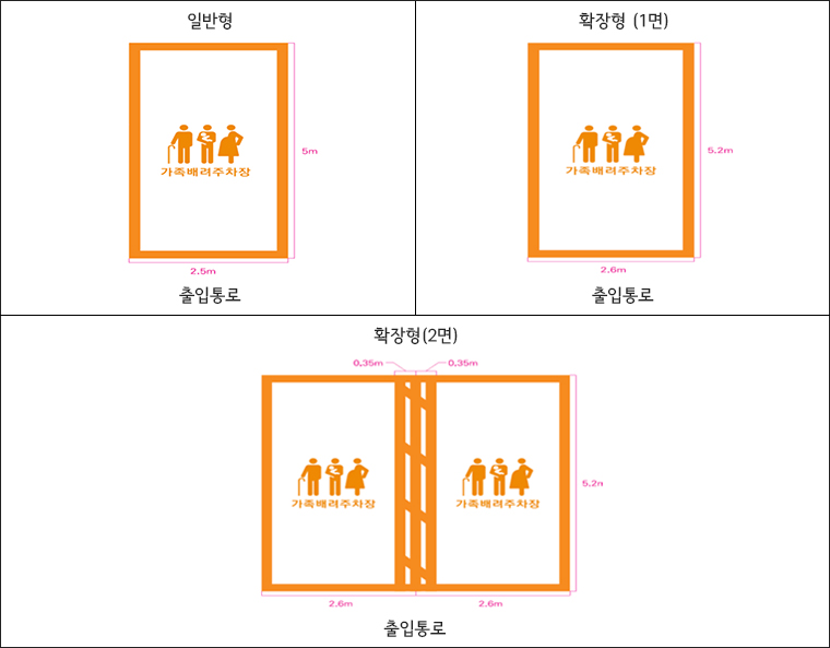 주차구획선은 흰색 바탕에 꽃담황토색 실선으로 표시하며 그림문자와 ‘가족배려주차장’ 글자도 꽃담황토색 실선으로 표시한다고 합니다.