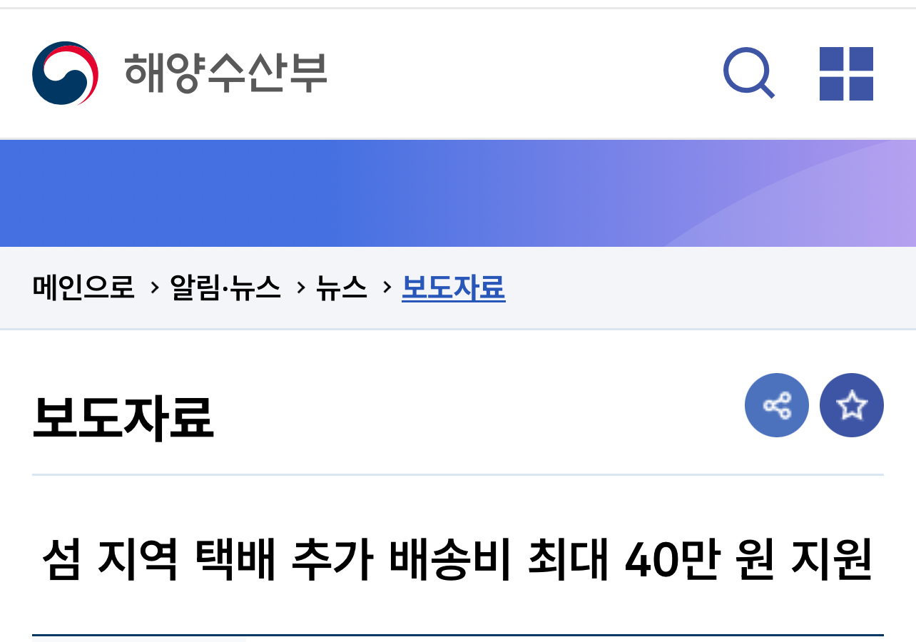 해양수산부는 택배서비스 이용 시 육지보다 높은 요금을 내야 하는 섬 주민들의 부담을 덜고 민생안정을 위해 2024년 1월 22일(월)부터 섬 주민을 대상으로 택배 추가 배송비를 지원한다고 밝혔습니다.