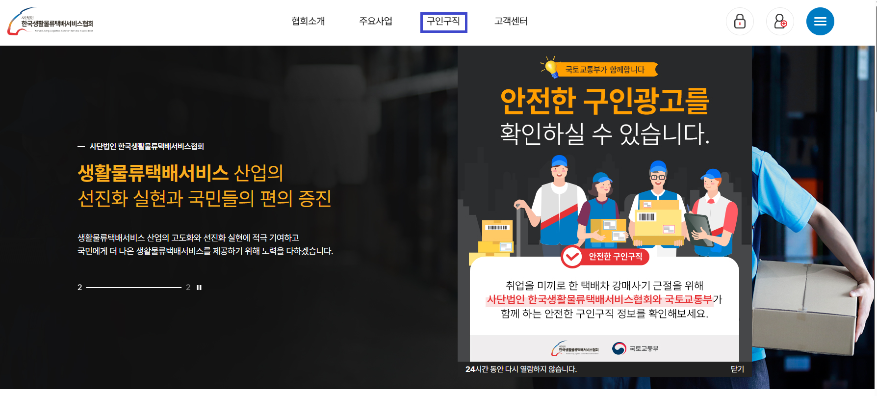 한국생활물류택배서비스협회 홈페이지(kllca.or.kr) 내 전용 배너에 구축