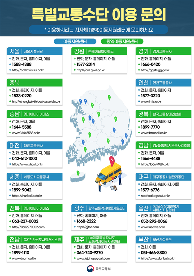 특별교통수단 장애인콜택시 이용은 이용하시려는 지자체(광역) 이동지원센터에 문의하시면 됩니다.