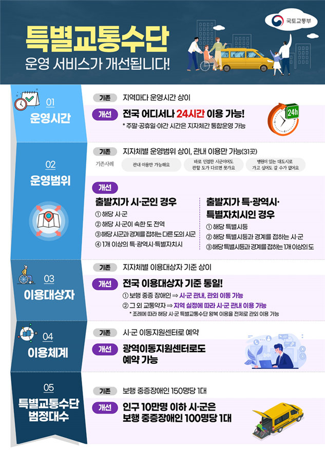 이와 함께 비도시지역의 교통약자 이동지원을 위해 인구 10만명 이하 시․군의 경우 특별교통수단 법정 운행대수 기준도 상향(중증 보행장애인 150명당 1대 → 100명당 1대) 합니다(‘24.1월부터 적용).