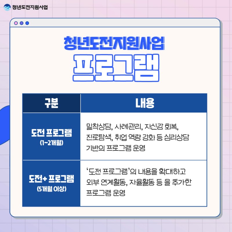 청년도전지원사업은 구직단념청년들의 구직 의욕을 고취시키고 청년의 노동시장 참여 및 취업 촉진을 위해 다양한 맞춤형 프로그램을 제공하는 고용노동부 사업입니다.