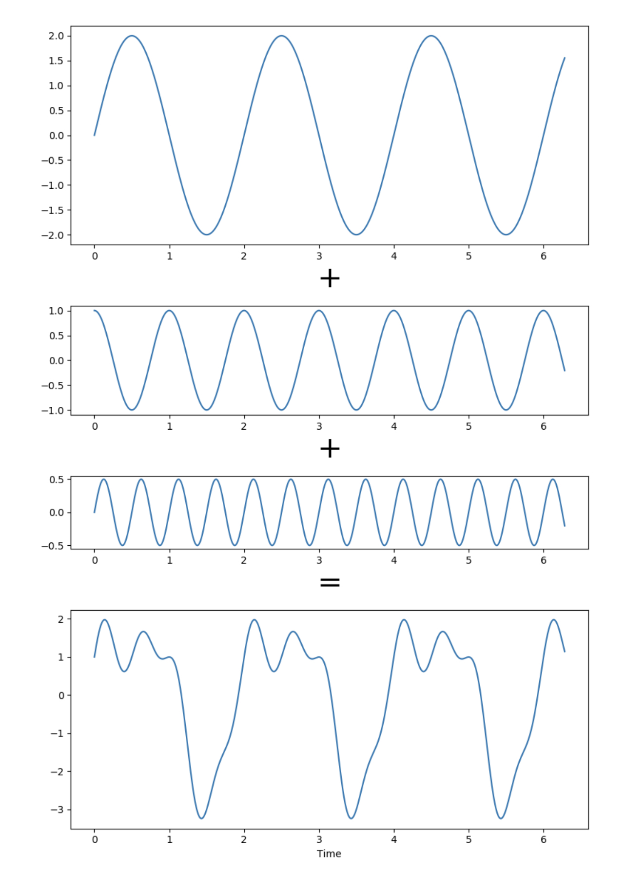 가장 단순한 파동을 떠올리면 누구나 사인함수를 떠올리는 것처럼 복잡한 파동도 이런 사인함수나 코사인함수와 같은 단순한 삼각함수들로 이루어져 있는데 이처럼 목소리도 각기 다른 진동수를 가진 삼각함수들의 합인 것입니다.