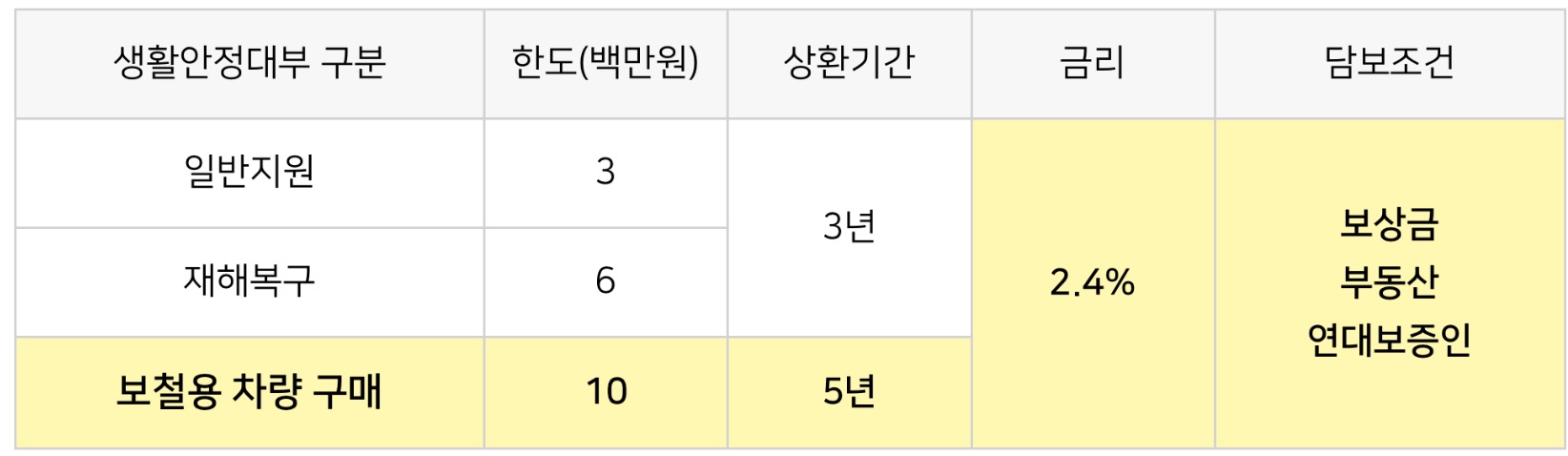 보철용 차량 구매의 경우, '생활안정대부' 제도로 대출 지원이 가능하며 자세한 내용은 다음과 같습니다.