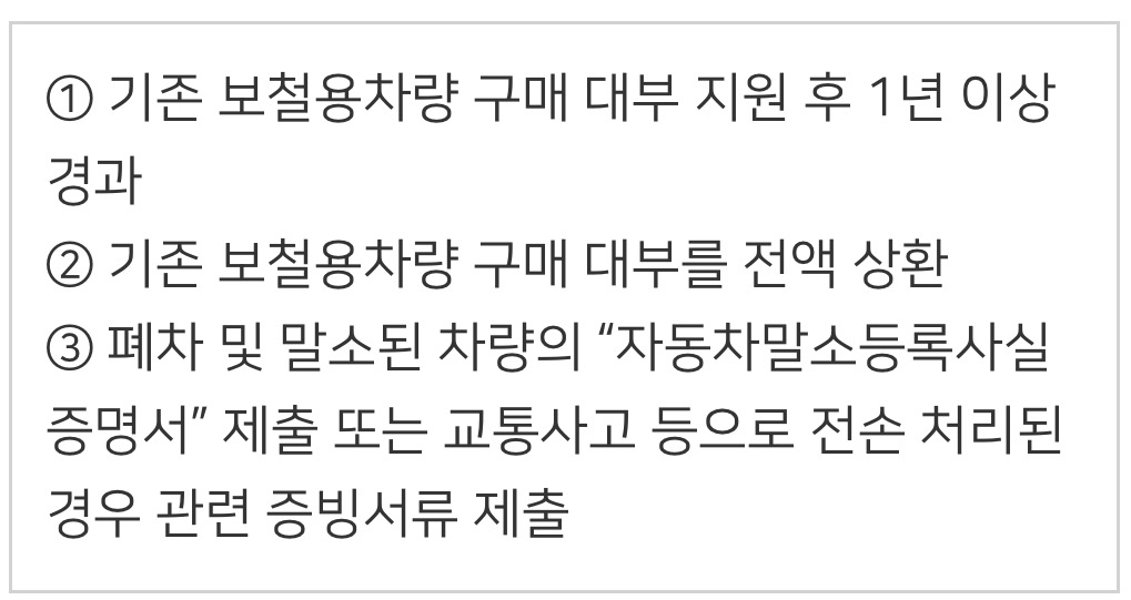 - 보철용 차량 구입 시 자동차 매매사업자로부터 구입한 경우만 인정(개인 간 거래는 지원이 불가능)