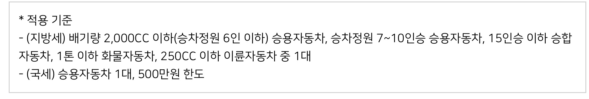 승용자동차는 배기량 제한 없이 가능하며 15인승 이하 승합자동차, 1톤 이하 화물자동차, 250CC 이하 이륜자 동차, 「환경친화적 자동차의 개발 및 보급 촉진에 관한 법률」 제2조 제3호의 전기자동차 및 같은 조 제6호의 연료 전지자동차 중 1대가 적용 가능