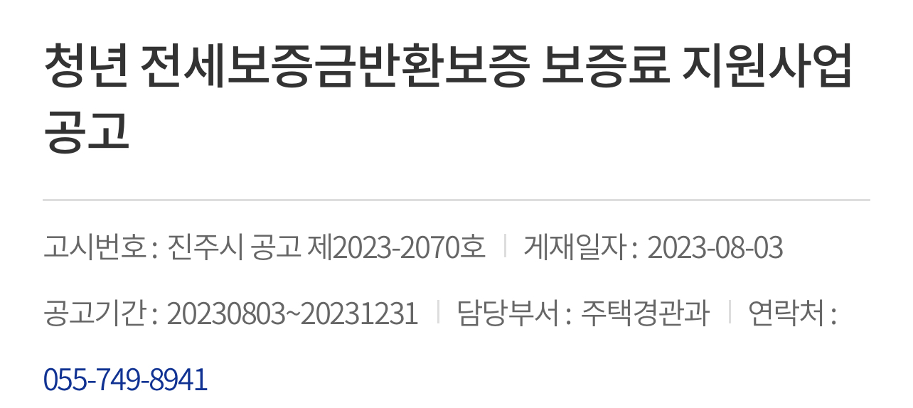 진주시 전세보증료 지원 신청기간은 오는 2023년 8월 7일부터 예산소진 시까지며 경남바로서비스를 통해 온라인으로 신청하거나 진주시청 주택경관과로 방문해 신청하면 됩니다.
