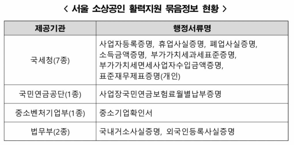 재단은 '서울 소상공인 활력지원' 묶음정보를 통해 최대 11종의 행정서류를 데이터 형태로 수집함에 따라 무서류, 무방문을 통해 사업을 지원할 수 있게 되었다고 합니다.