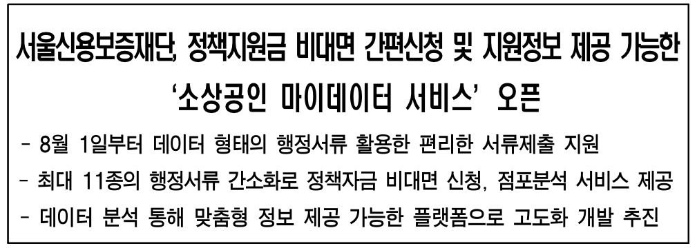 서울신용보증재단(이사장 주철수, 이하 재단)은 2023년 8월 1일부터 행정안전부 공공마이데이터 묶음정보를 활용한 소상공인 마이데이터 서비스 (mydata.seoulshinbo.co.kr)를 운영한다고 밝혔습니다.