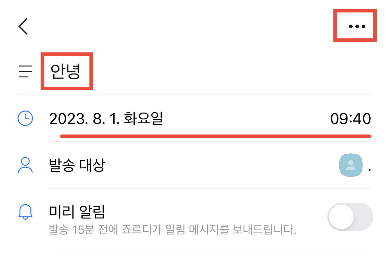 그러면 메시지 수정 및 전송시간 수정이 가능하고 우측 상단에 ...을 누르면 삭제도 가능합니다.
