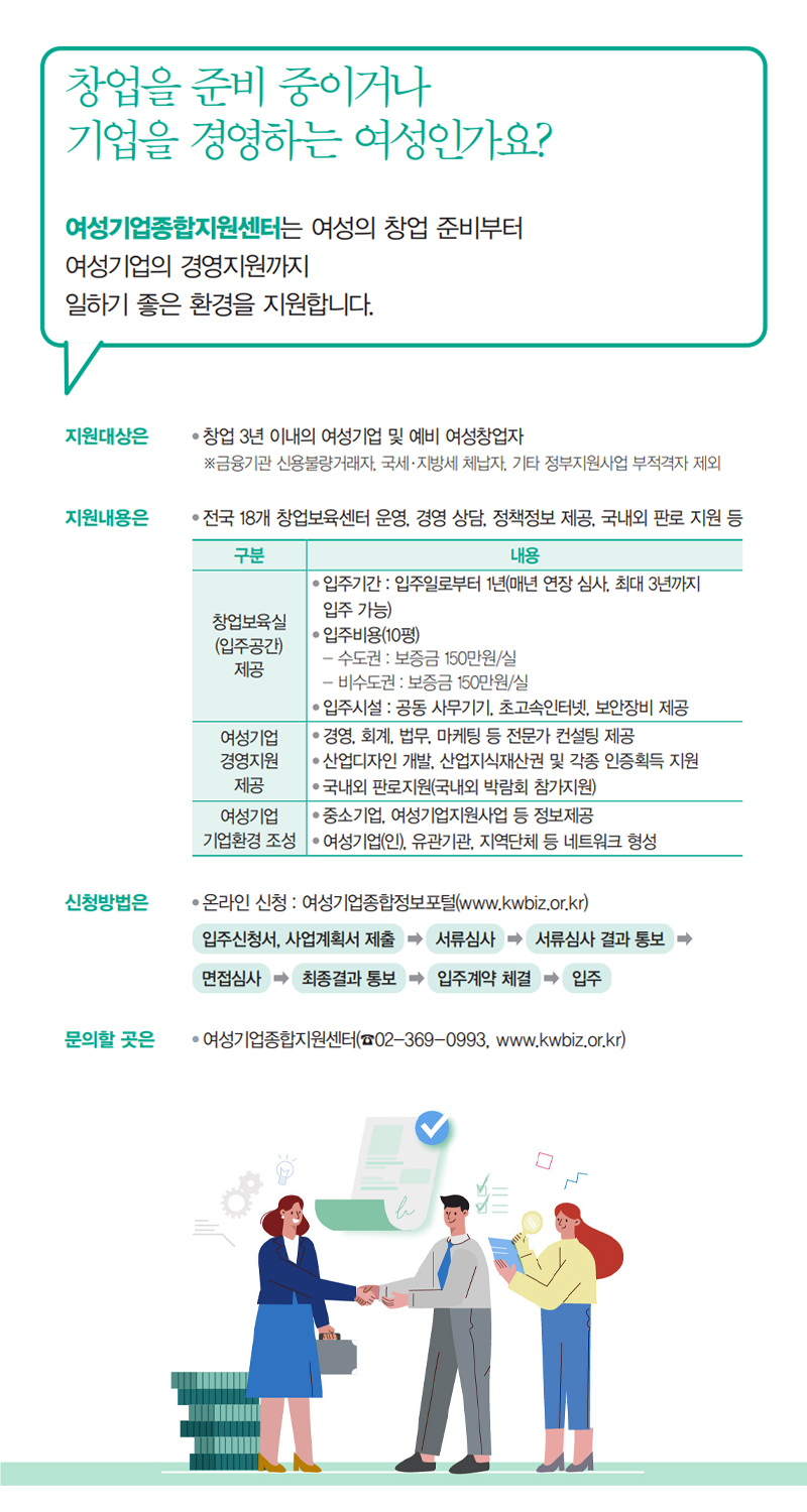 보다 자세한 문의는 여성기업종합지원센터(☎02-369-0993)로 문의하시길 바랍니다.