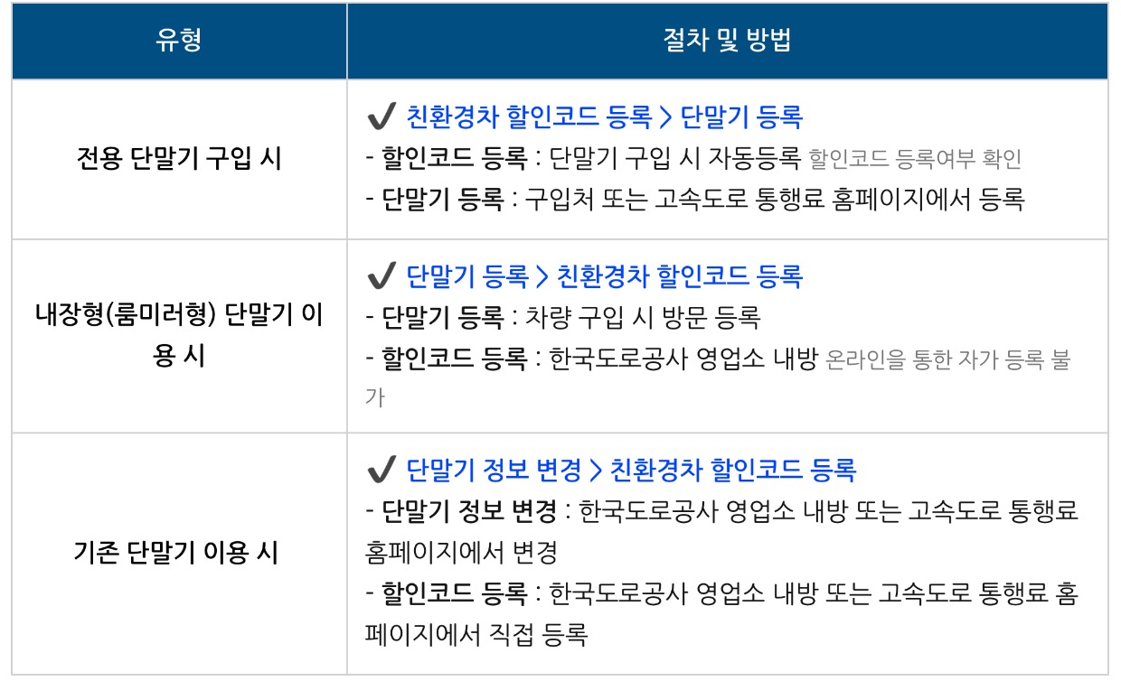 - 할인코드 등록 : 한국도로공사 영업소 내방 또는 고속도로 통행료 홈페이지에서 직접 등록
