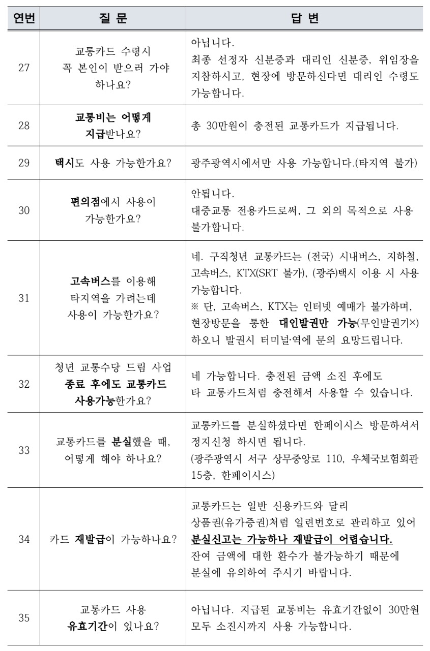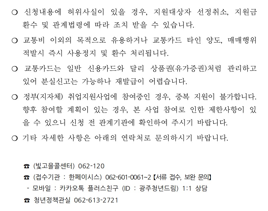광주시는 주기적으로 모니터링을 실시, 구직 활동을 위한 교통비 이외의 목적으로 유용하거나 교통카드를 타인에게 양도·매매하는 행위가 적발되면 즉시 사용을 정지하고 환수한다고 합니다.