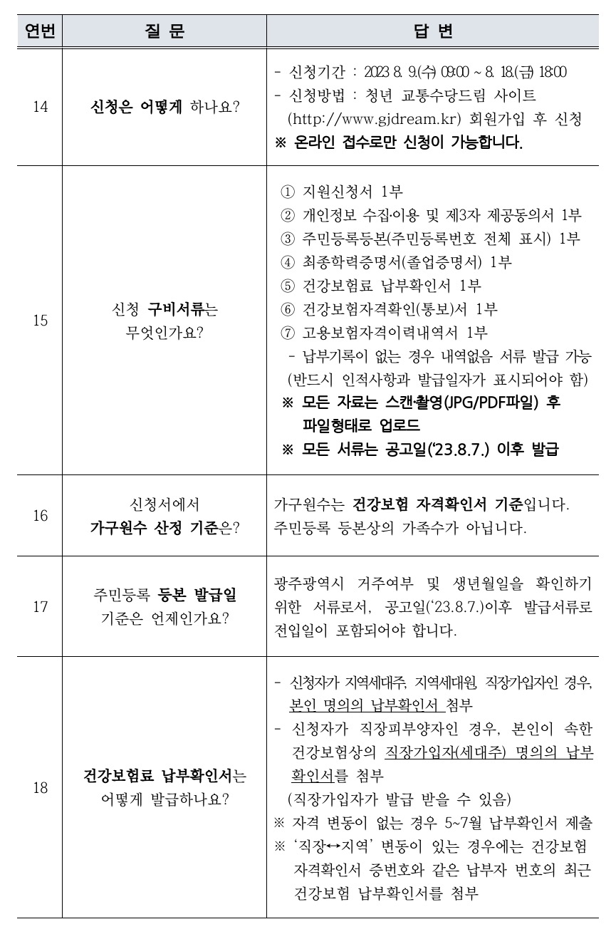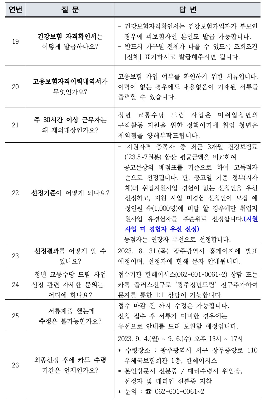 보다 자세한 내용은 광주시, 청년교통수당 드림, 광주청년정책플랫폼 누리집에서 확인할 수 있습니다.
