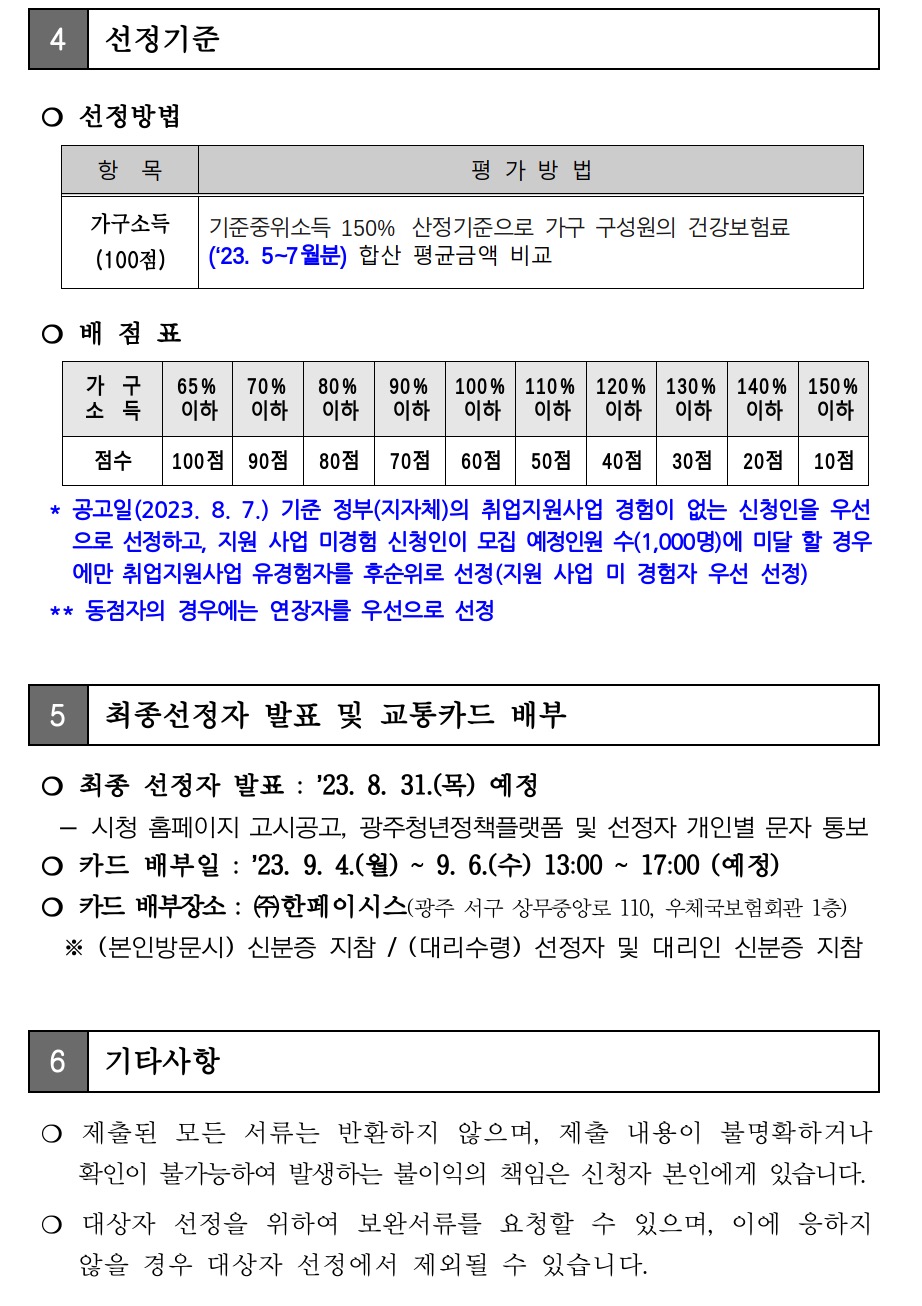 광주시는 신청자의 가구소득·거주지 요건 등 적격 여부를 심사, 오는 2023년 8월 31일 최종 선정자를 공고하고 최종 선정자에게는 문자를 통해 개별 안내한다고 합니다.