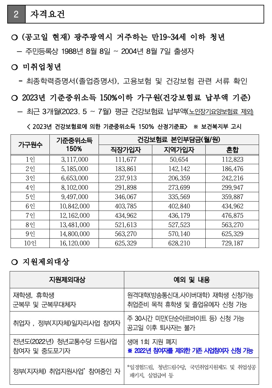 광주 청년교통 수당드림 사업 참여 자격은 공고일 기준 광주시에 거주하고 있는 만 19~34세 구직활동 중인 미취업청년으로 기준중위소득 150% 이하여야 합니다.