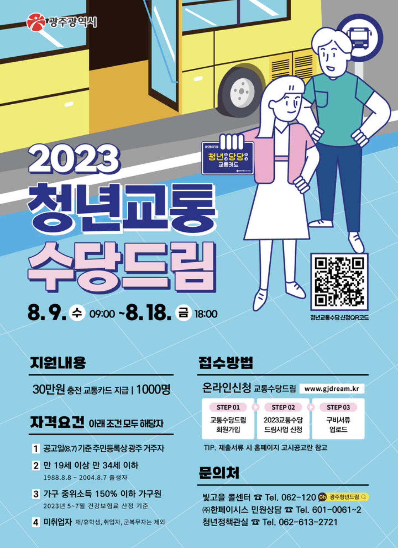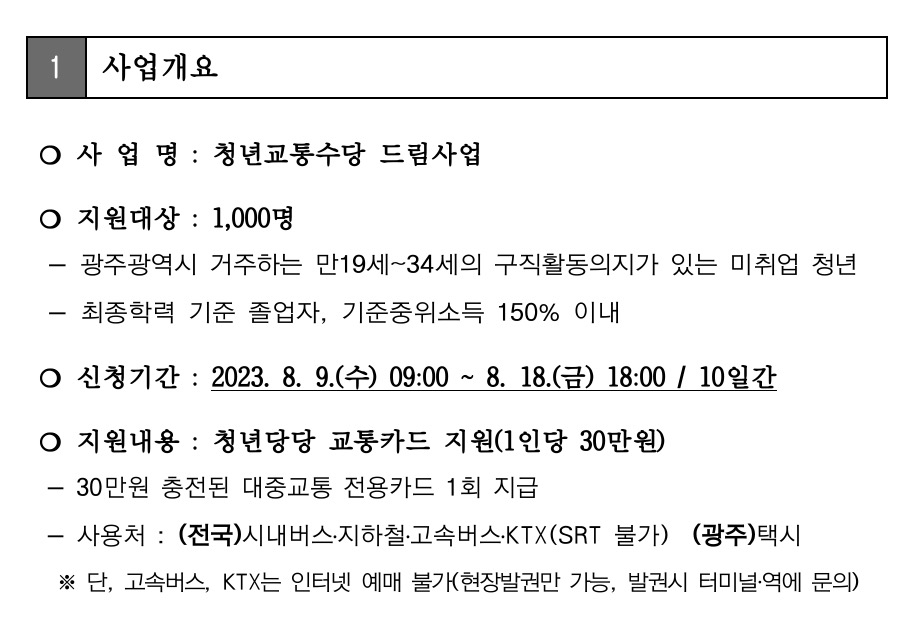 광주광역시는 미취업청년의 구직활동과 생활 안정을 지원하기 위해 오는 2023년 8월 9일부터 8월 18일까지 청년교통수당 드림사업 참여자 1000명을 모집한다고 밝혔습니다.