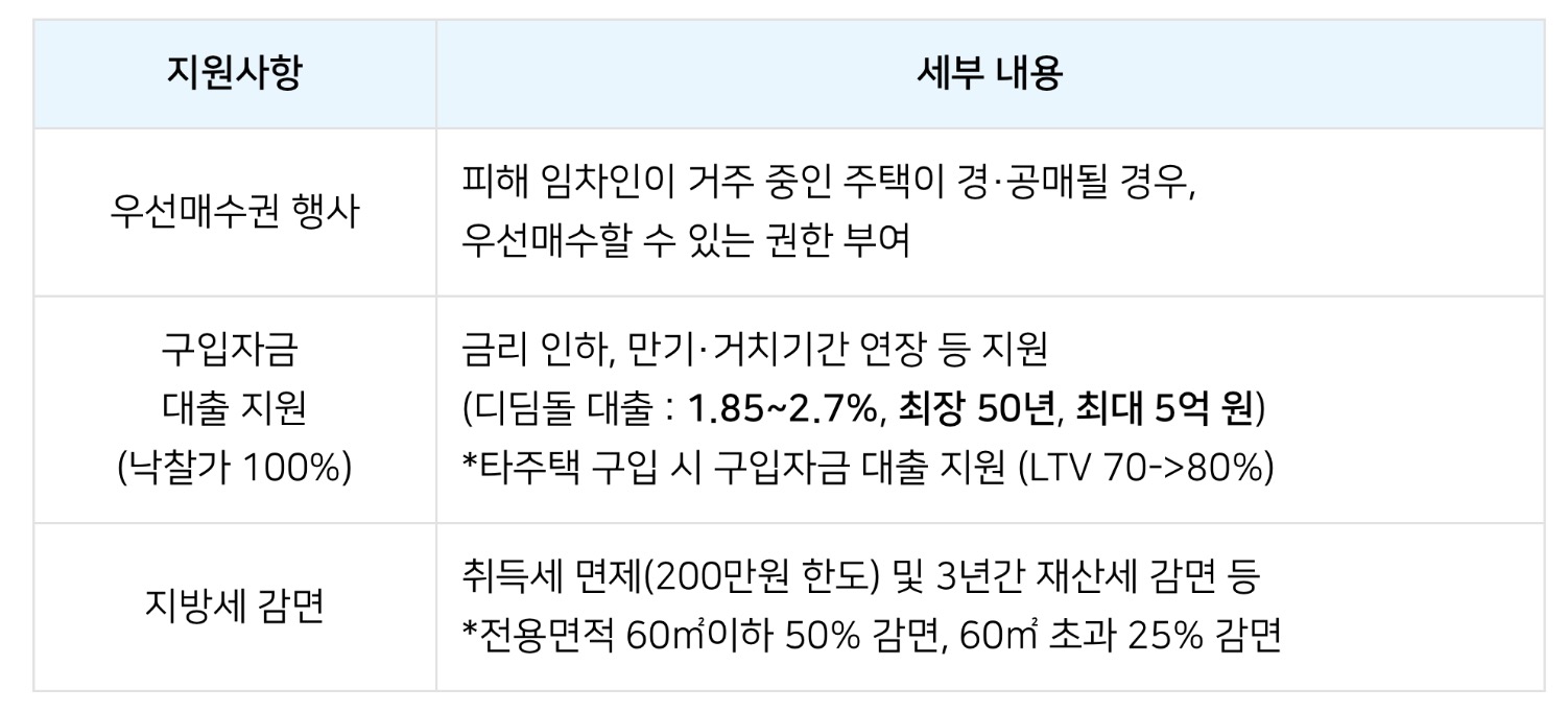 우선매수권 행사: 피해 임차인이 거주 중인 주택이 경•공매될 경우, 우선매수할 수 있는 권한 부여