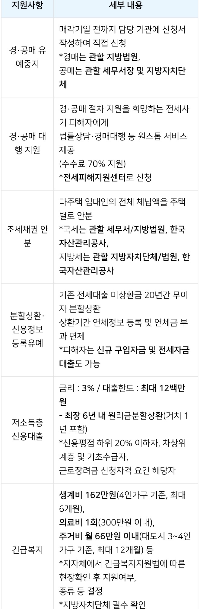 긴급복지: 생계비 162만원(4인가구 기준, 최대 6개월), 의료비 1회(300만원 이내), 주거비 월 66만원 이내(대도시 3~4인 가구 기준, 최대 12개월) 등