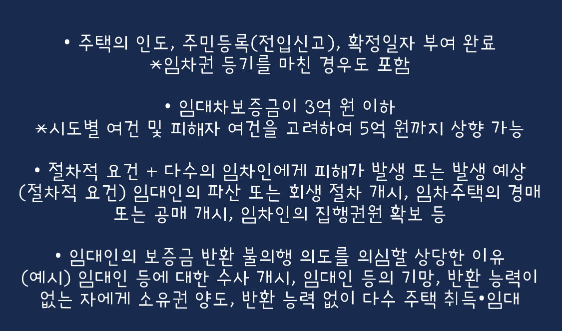 (절차적 요건) 임대인의 파산 또는 회생 절차 개시, 임차주택의 경매 또는 공매 개시, 임차인의 집행권원 확보 등