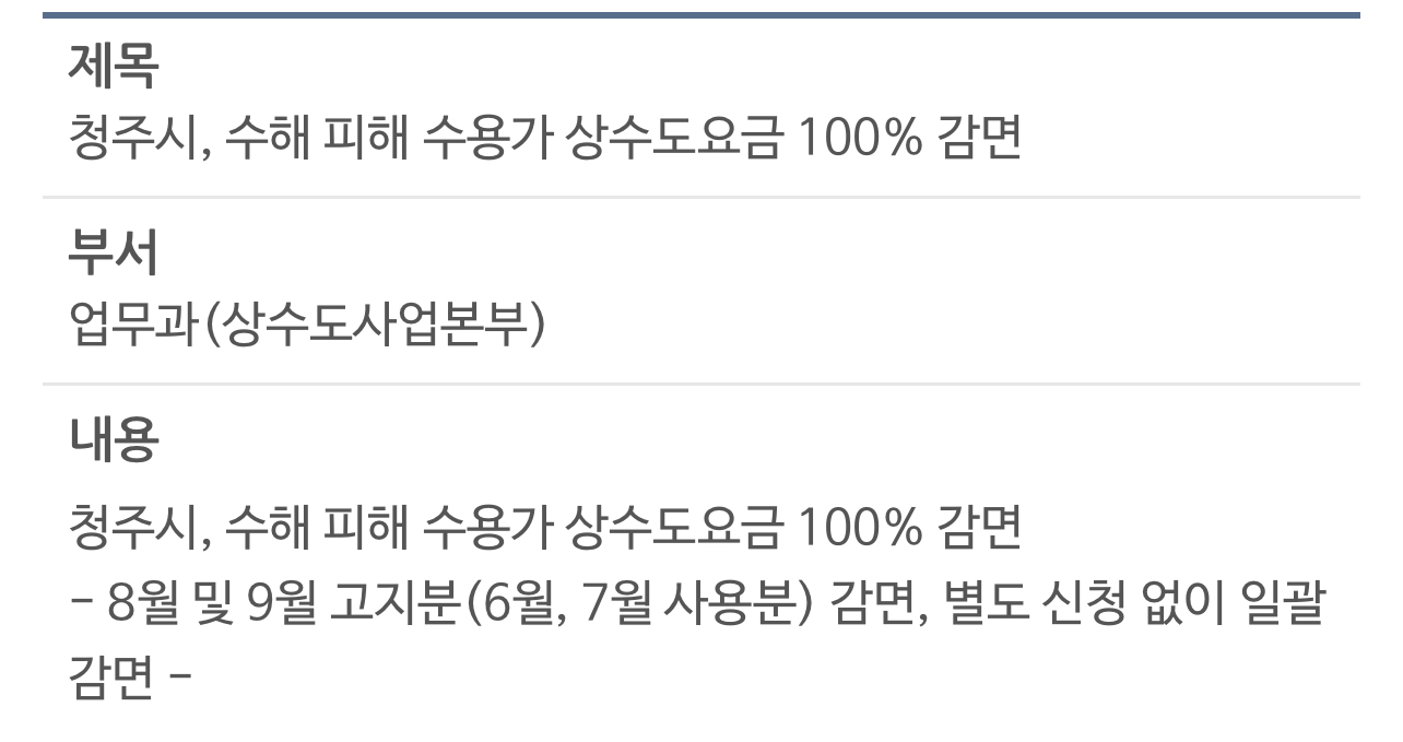 청주시 수해 피해 수용가 상수도요금 100% 감면대상은 국가재난관리시스템(NDMS)에 등록된 피해시설 중 상수도를 사용하는 수용가입니다.