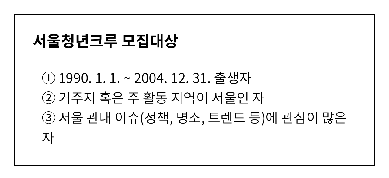 정책 홍보에 대한 역량을 키우는 동시에 다양한 경험을 할 수 있는 ‘서울청년크루’는 아래 요건을 모두 충족한다면 누구나 지원할 수 있습니다.
