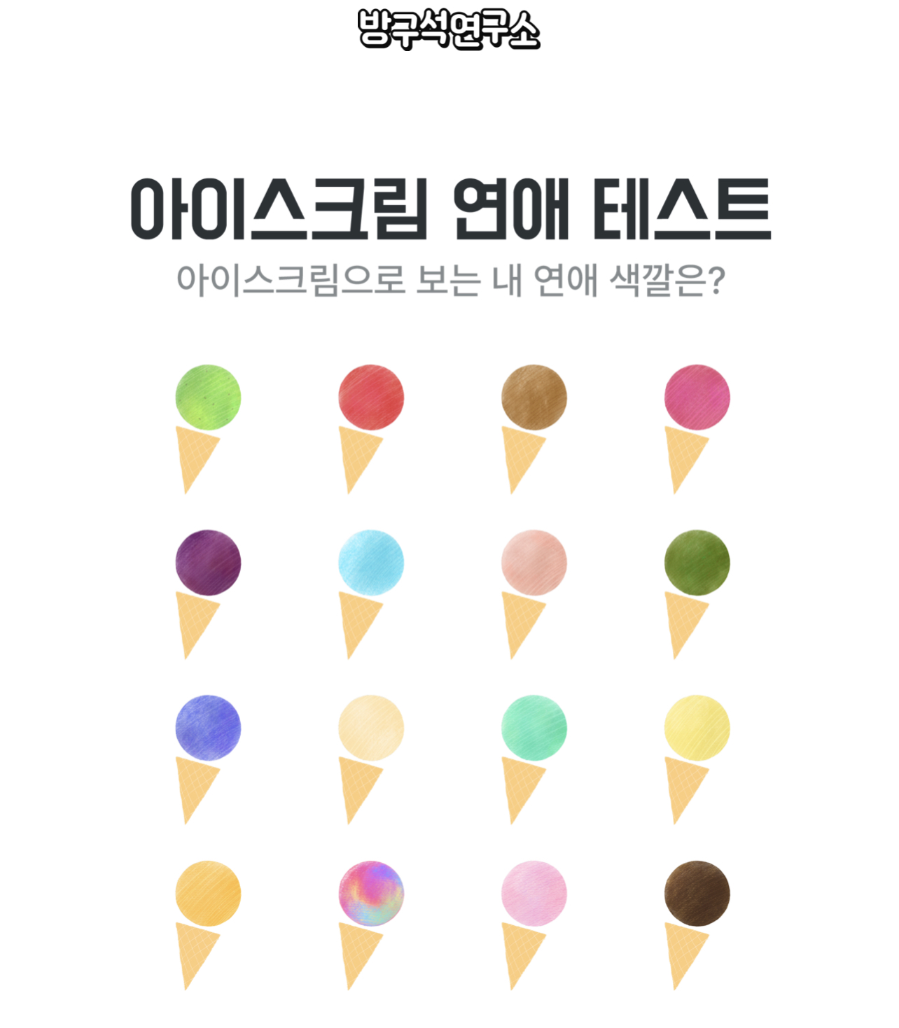 달콤하고 시원한 아이스크림은 남녀노소 누구에게나 사랑받는 음식인데 이런 아이스크림으로 알아보는 나의 연애 성향 테스트가 방구석연구소에 새로 나와서 소개드릴려고 합니다.