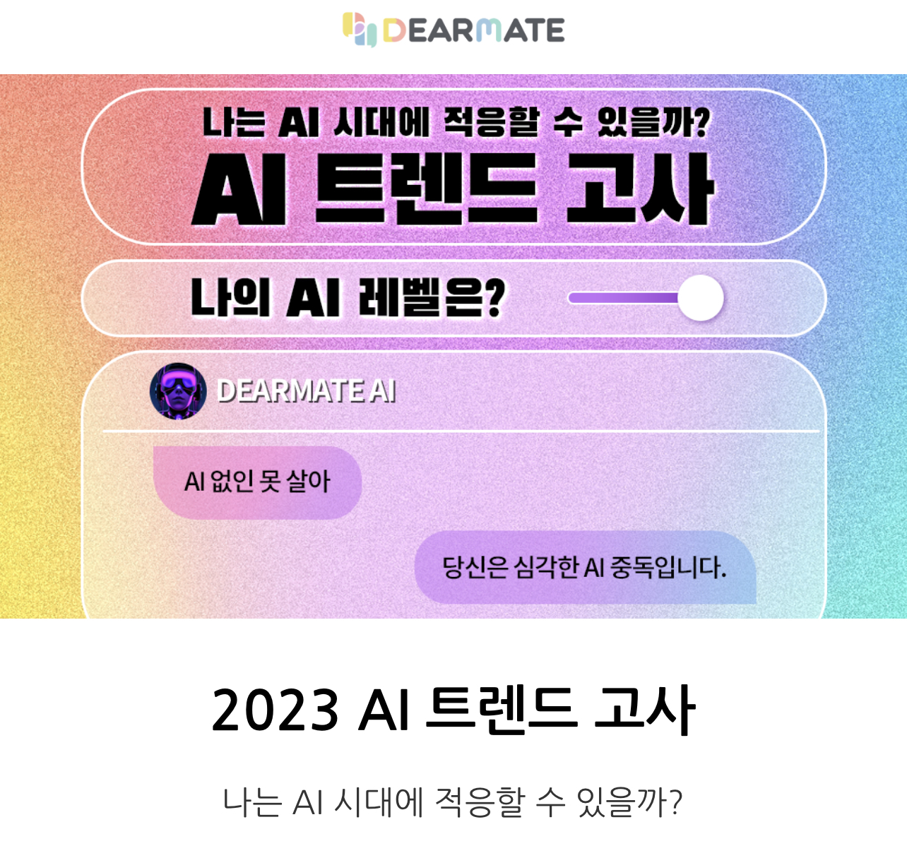 요즘 인터넷에서 다양한 기술력을 보여주는 ai기술이 대세인데 “나는 ai 시대에 적을할 수 있을까?” 나의 AI 레벨은 몇인지 알아보는 AI 트렌드 고사 테스트를 소개드리겠습니다.