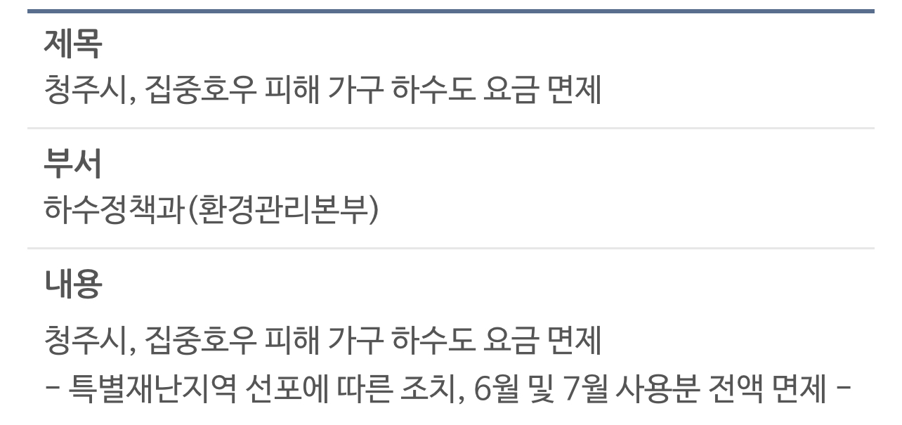 청주시 집중호우 피해 가구 하수도 요금 면제 감면 대상은 지난 집중호우로 인해 국가재난관리시스템(NDMS)에 접수된 피해 신고 가구 중 하수도 시설을 사용하고 있는 수용가이며 대상 건수는 8월 2일 현재 600여 건이라고 합니다.
