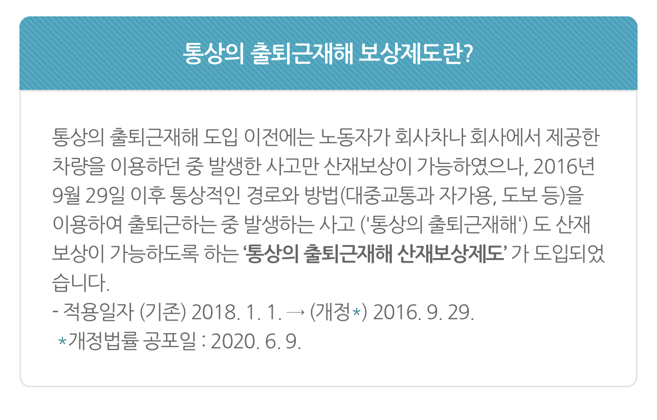 통상의 출퇴근재해 도입 이전에는 노동자가 회사차나 회사에서 제공한 차량을 이용하던 중 발생한 사고만 산재보상이 가능하였으나, 2016년 9월 29일 이후 통상적인 경로와 방법(대중교통과 자가용, 도보 등)을 이용하여 출퇴근하는 중 발생하는 사고 ('통상의 출퇴근재해') 도 산재보상이 가능하도록 하는 ‘통상의 출퇴근재해 산재보상제도’ 가 도입되었습니다.