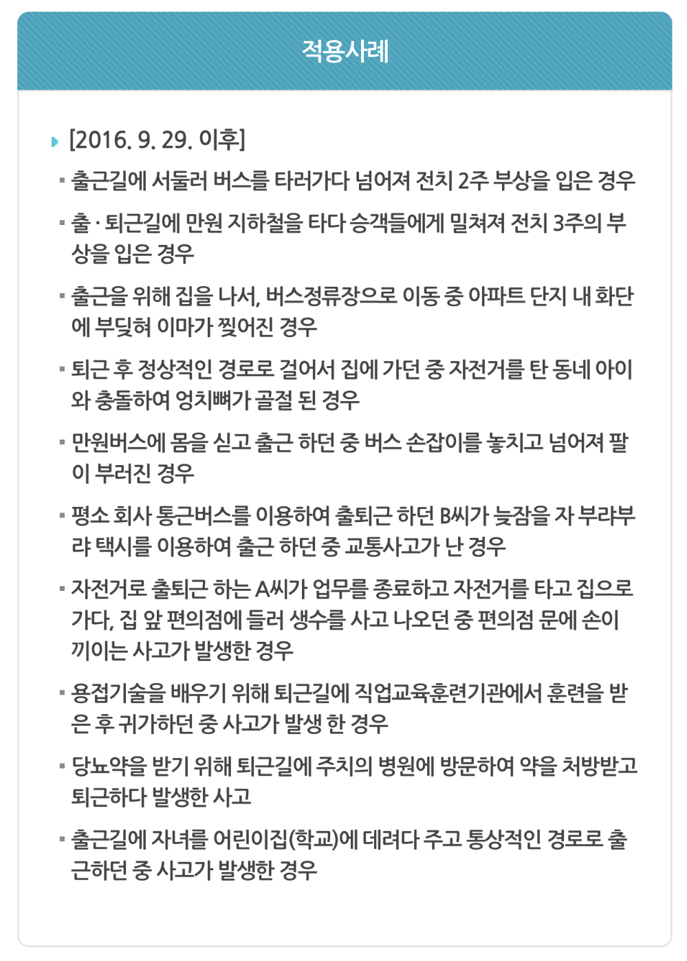 • 출근길에 서둘러 버스를 타러 가다 넘어져 전치 2주 부상을 입은 경우