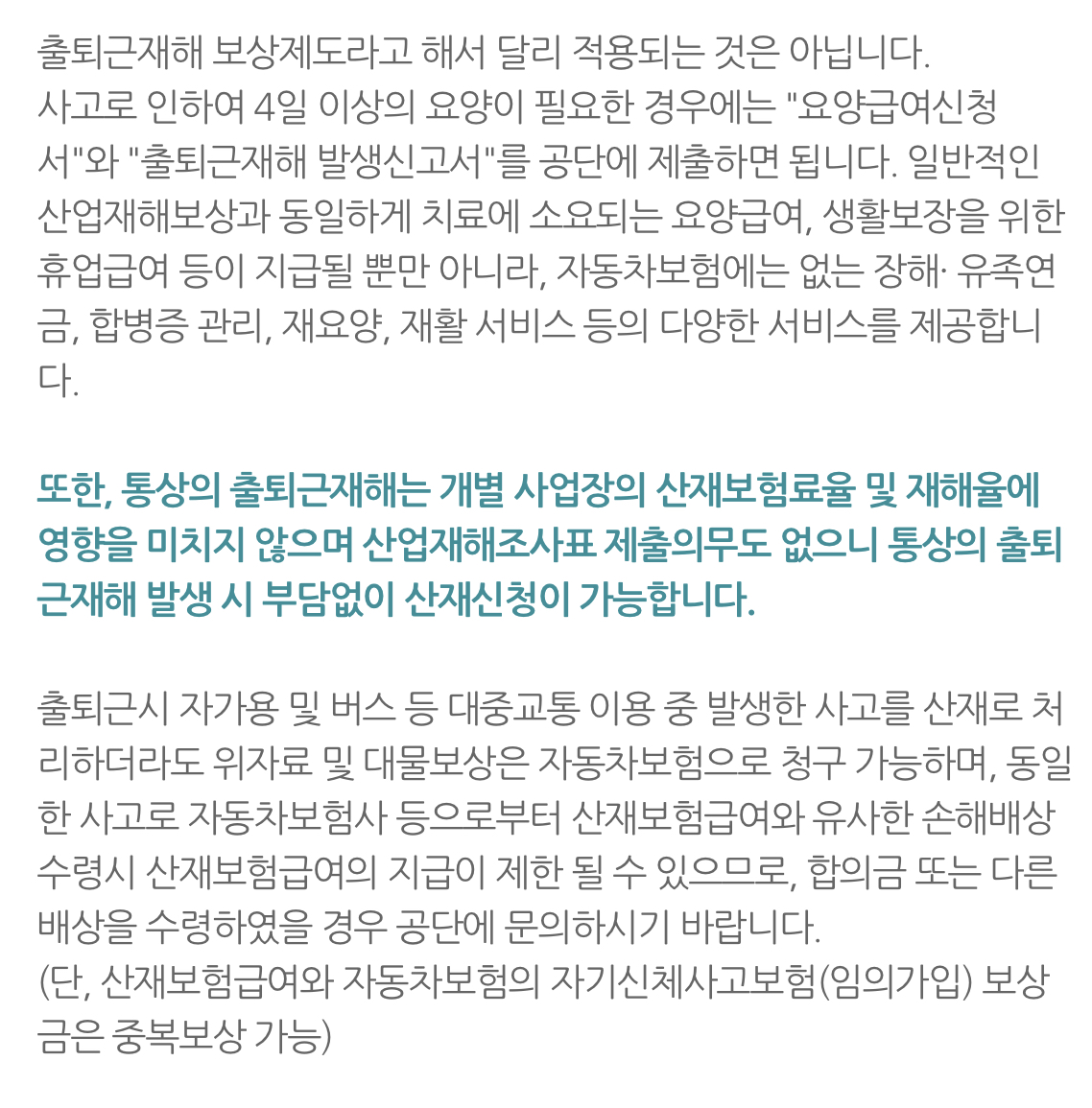 출퇴근 시 자가용 및 버스 등 대중교통 이용 중 발생한 사고를 산재로 처리하더라도 위자료 및 대물보상은 자동차보험으로 청구 가능하며 동일한 사고로 자동차보험사 등으로부터 산재보험급여와 유사한 손해배상 수령 시 산재보험급여의 지급이 제한될 수 있으므로, 합의금 또는 다른 배상을 수령하였을 경우 공단에 문의하시기 바랍니다.