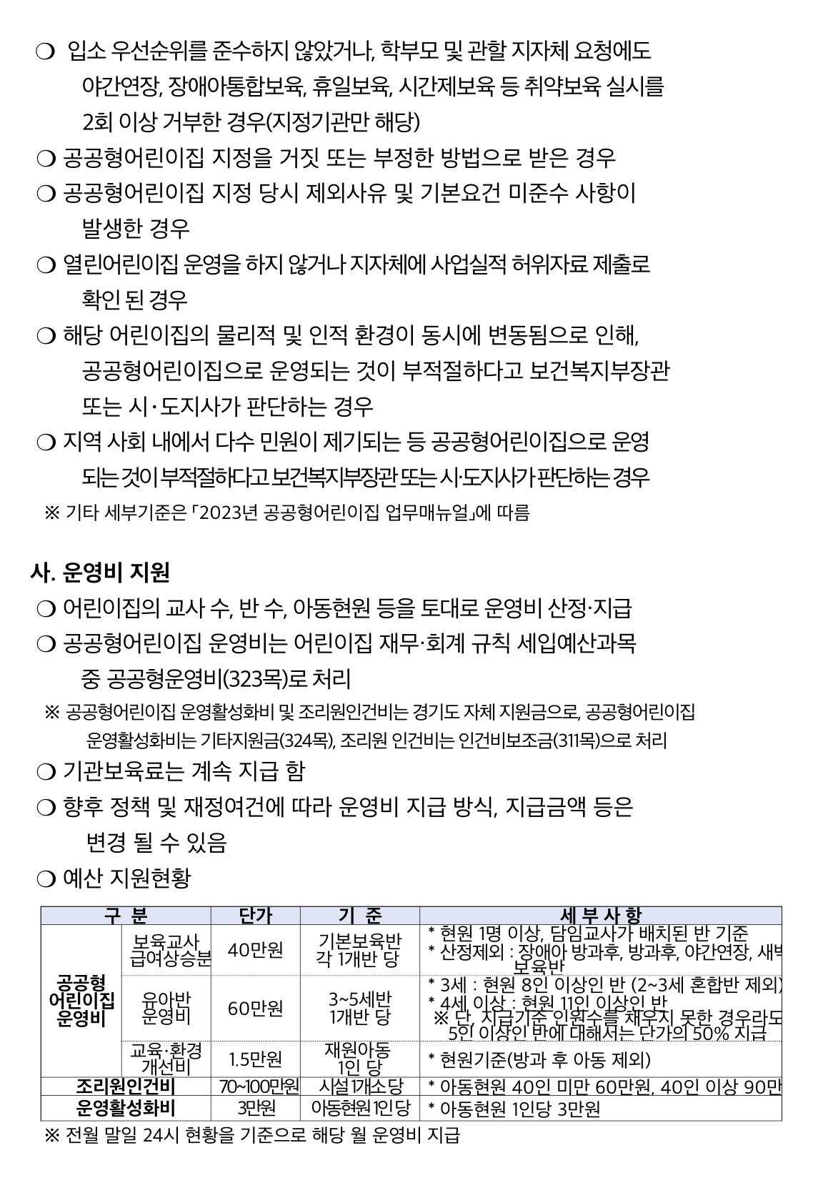 선정된 공공형 어린이집에는 교사 수, 반 수, 아동 현원을 토대로 ▲기본보육반 1개반당 월 40만 원 ▲유아반 운영비 1개반당 60만 원 ▲아동 1인당 교육·환경비 1만 5천 원, 운영활성화비 3만 원 ▲아동 규모별 조리원 인건비 70만~100만 원을 지원한다고 합니다.