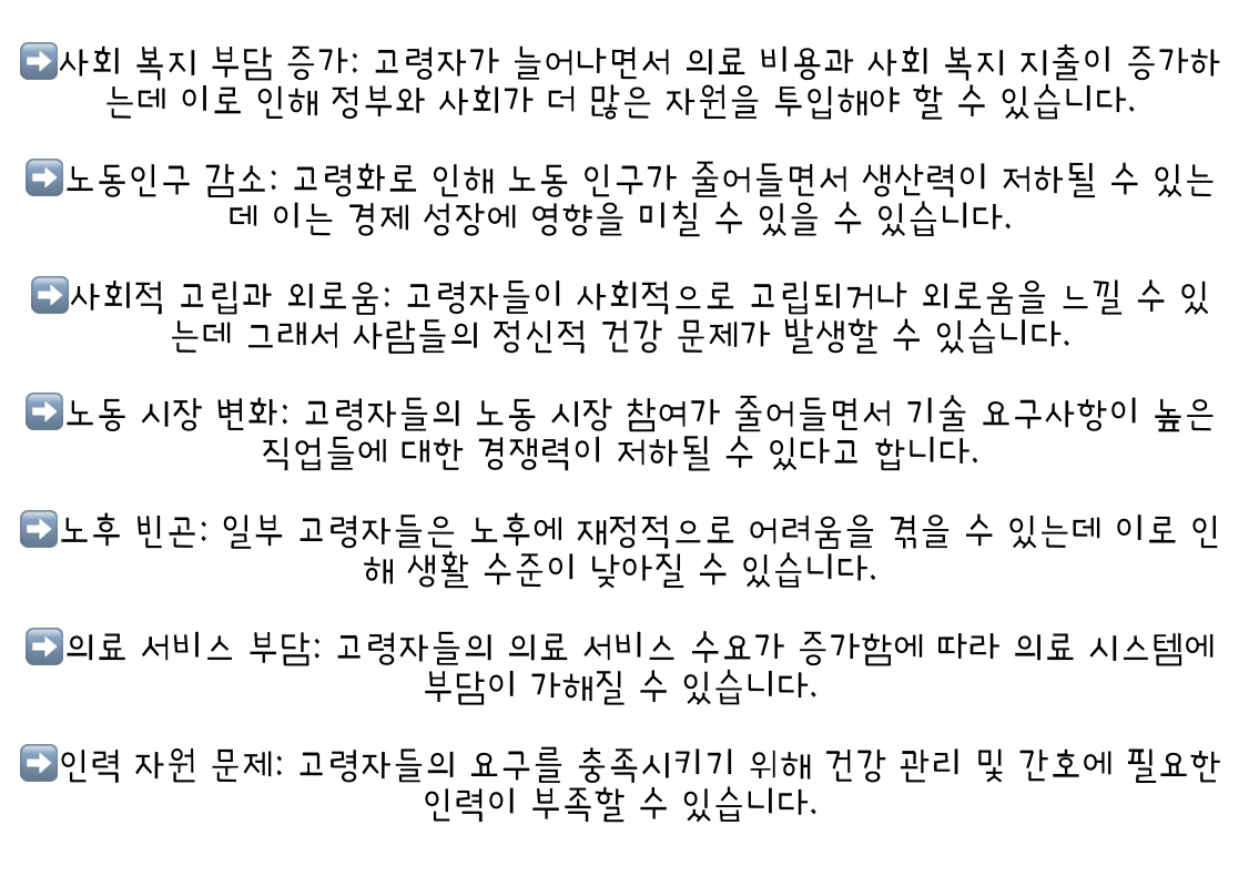 ➡️인력 자원 문제: 고령자들의 요구를 충족시키기 위해 건강 관리 및 간호에 필요한 인력이 부족할 수 있습니다.