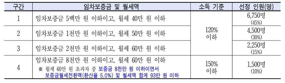 서울시는 실질적으로 주거비 부담을 크게 느끼는 저소득 청년의 어려움을 덜어주기 위해 임차보증금과 월세가 낮은 구간(보증금 1천만 원 이하, 월세 50만 원 이하)에 많은 인원을 배정(75%, 11,250명)해 지원할 예정이라고 합니다.