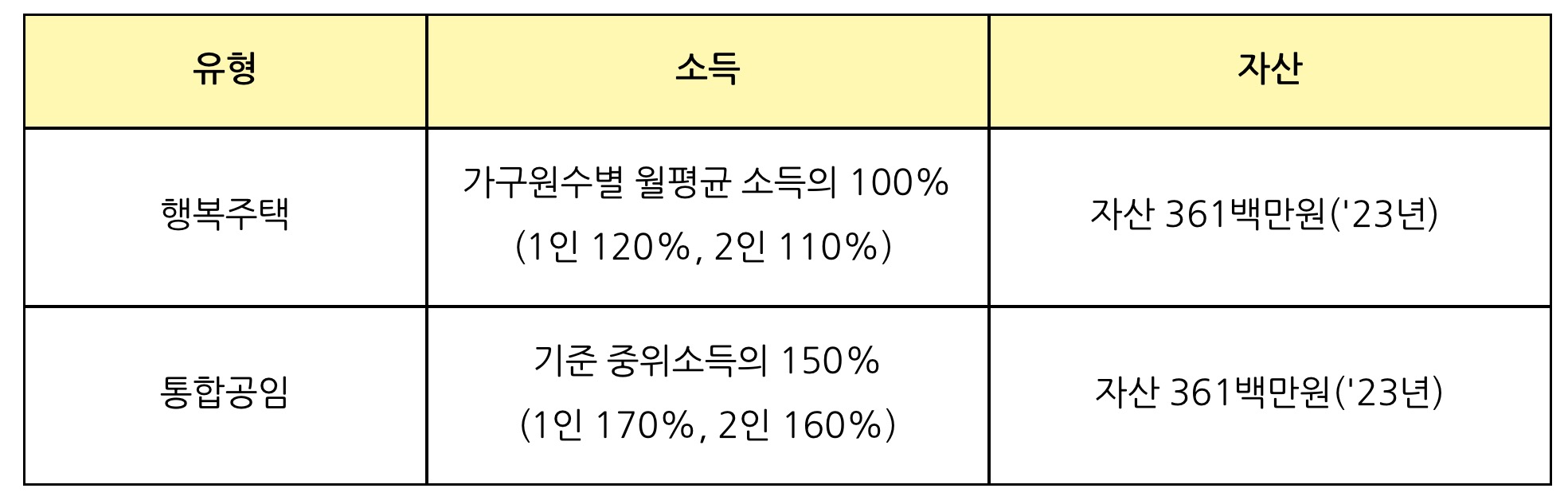 • 행복주택: 가구원수별 월평균 소득의 100%(1인 120%, 2인 110%) / 자산 361백만원('23년)