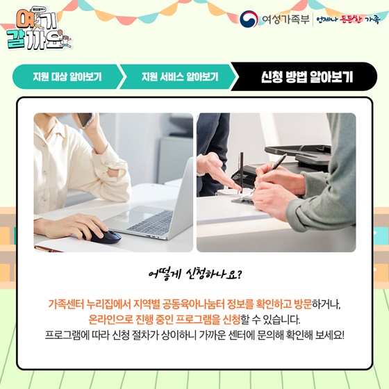 가족센터 누리집에서 지역별 공동육아나눔터 정보를 확인하고 방문하거나, 온라인으로 진행 중인 프로그램을 신청할 수 있습니다.