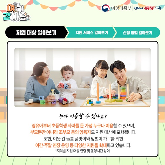 영유아부터 초등학생 자녀를 둔 가정 누구나 이용할 수 있으며, 부모뿐만 아니라 조부모 등의 양육자도 지원 대상에 포함됩니다. 또한, 이웃 간 돌봄 품앗이와 맞벌이 가구를 위한 야간·주말 연장 운영 등 다양한 지원을 확대하고 있습니다.