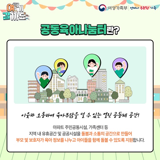 공동육아나눔터란 이웃과 소통하며 육아부담을 덜 수 있는 열린 공동체 공간입니다. 아파트 주민공동시설, 가족센터 등 지역 내 유휴공간 및 공공시설을 돌봄과 소통의 공간으로 만들어 부모 및 보호자가 육아 정보를 나누고 아이들을 함께 돌볼 수 있도록 지원합니다.