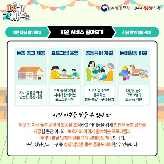 이웃 간 자녀 돌봄 품앗이 활동을 조성하고 아이들을 위해 안전한 돌봄 공간을 제공할 뿐만 아니라, 보호자와 아이가 함께하는 프로그램과 아이의 발달 단계에 맞춘 교육 콘텐츠도 제공합니다.