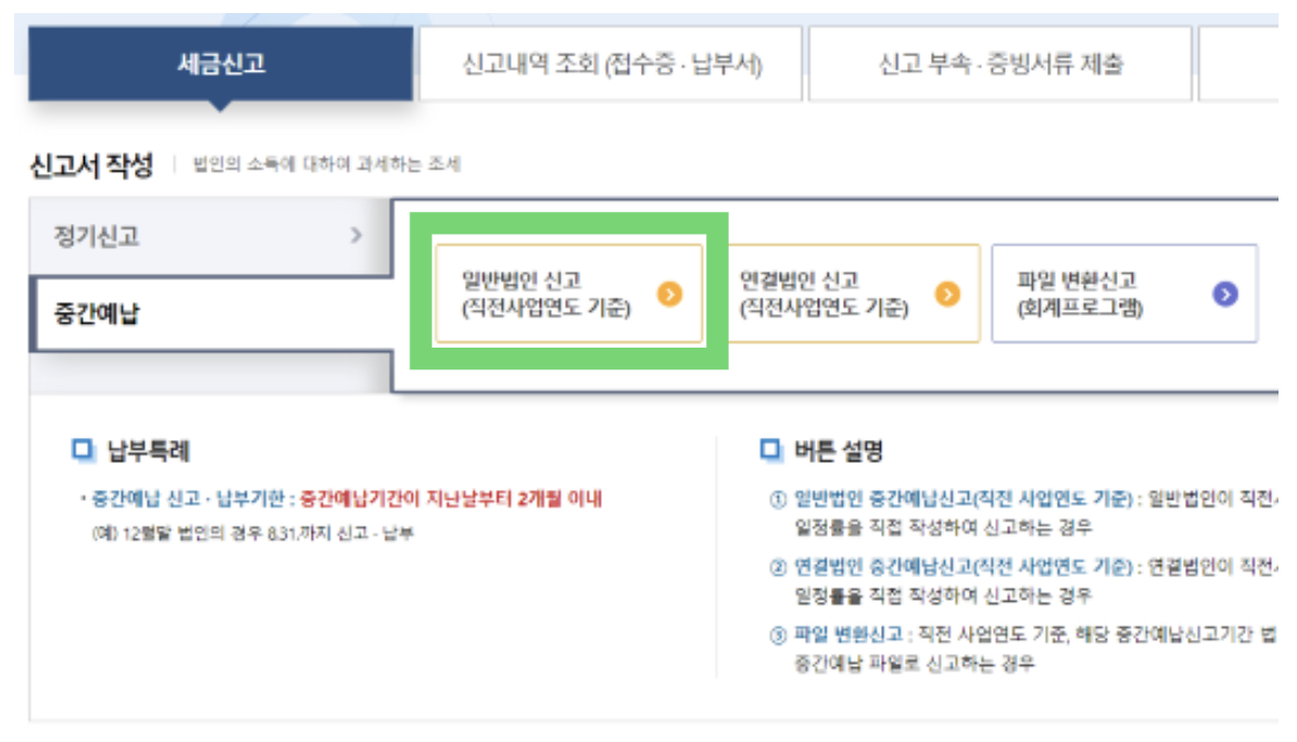 신고/납부 > 세금신고 > 법인세 > 중간예납 > 직전 사업연도 기준 신고