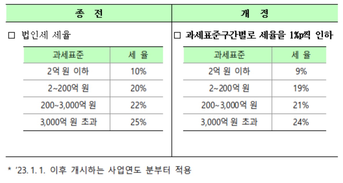 과세표준구간별로 세율을 1%씩 인하하여 법인세 부담 경감 및 투자•일자리 창출을 지원합니다.