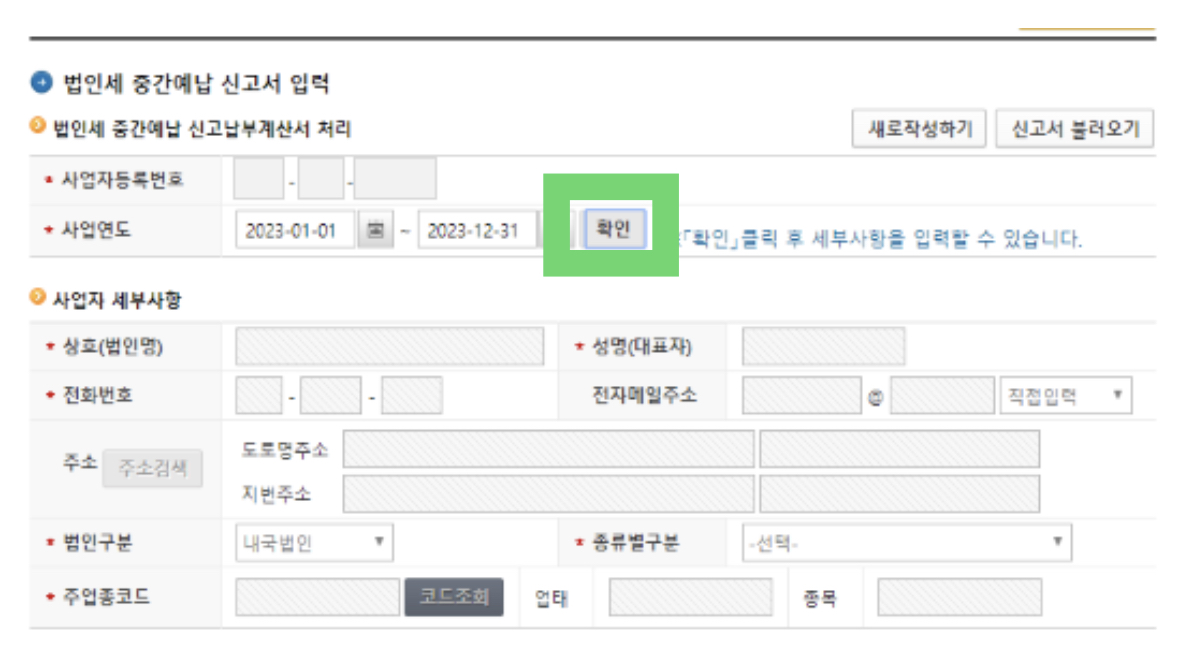 3. 사업자등록번호 및 사업연도 '확인' 클릭