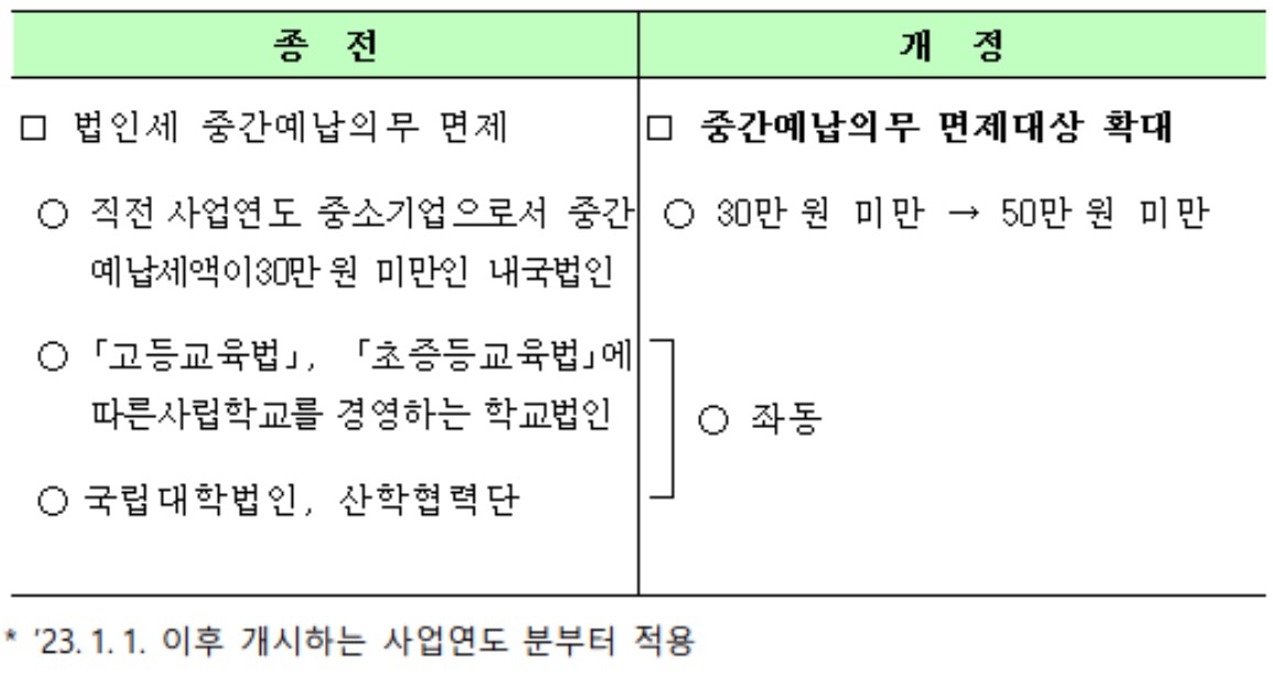직전사업연도 중소기업으로서 중간예납세액이 50만 원 미만인 내국법인의 중간예납의무를 면제함으로써 중소기업의 납세 편의를 제고합니다.