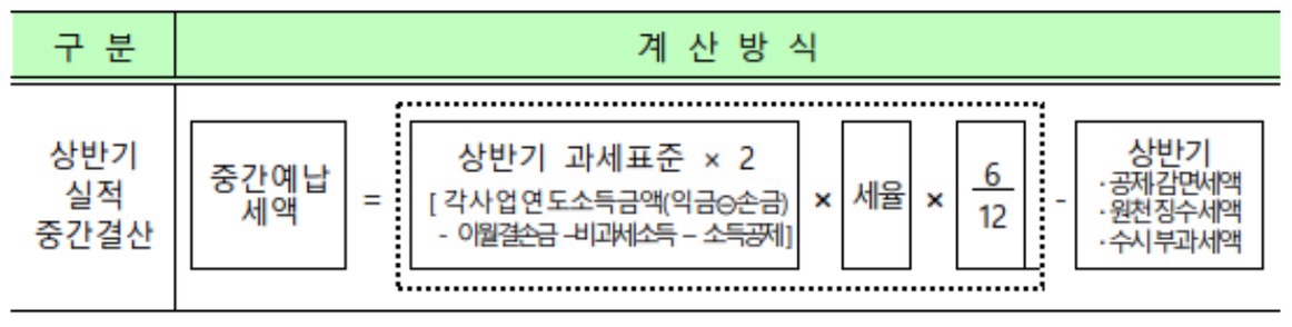 중간예납세액 계산 방법 직전 사업연도 산출세액을 기준으로 납부하는 방식과 상반기(1월 ~ 6월) 실적을 중간결산하는 방식 중 선택할 수 있습니다.