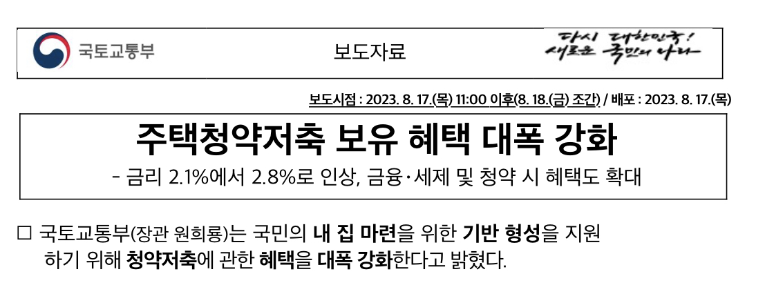 이번 제도개선 사항 중 청약저축 및 대출금리 조정, 금융혜택 강화는 2023년 8월 중 시행 예정이고 세제 및 청약혜택 강화는 법령 개정 등 절차를 거쳐 올해 하반기 중 완료 예정이라고 합니다.