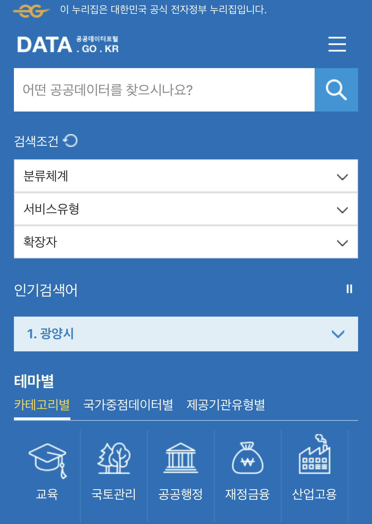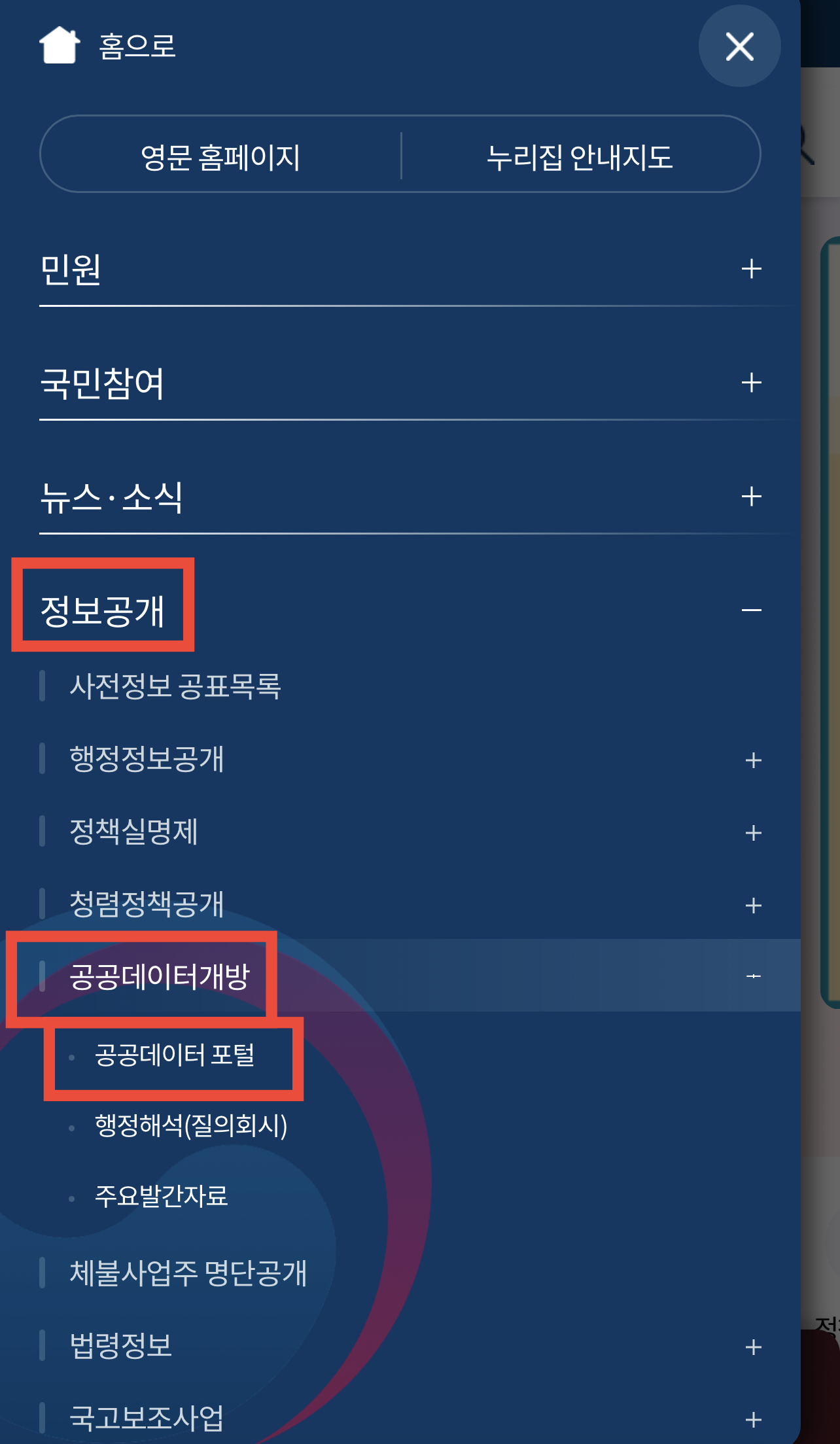 그 다음에는 정보공개 > 공공데이터 개방 > 공공데이터 포털로 들어가시길 바랍니다.